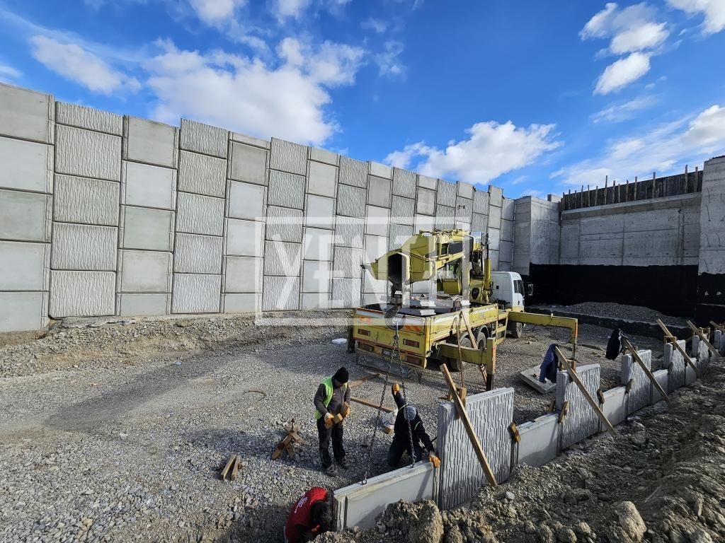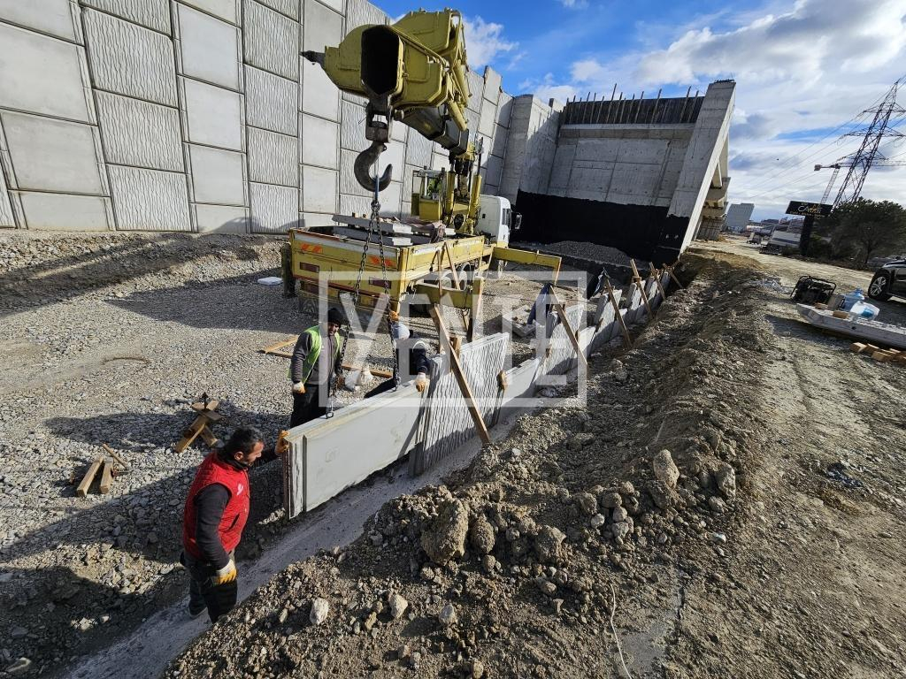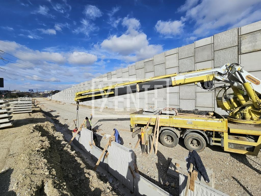 YENTE'nin prefabrik beton panelleri — ya da tasarıma göre modüler blok birimleri — kaldırılarak belirlenen eksen ve kota hizalanır. Donatı elemanlarının bağlantı noktaları panel tasarımına entegre edilmiştir; bu sayede her katta yüz ile donatı ızgarası arasında güvenli yük aktarımı sağlanır. Panel derzlerine filtre geotekstili yerleştirilerek dolgu göçü önlenirken drenaj serbest bırakılır.